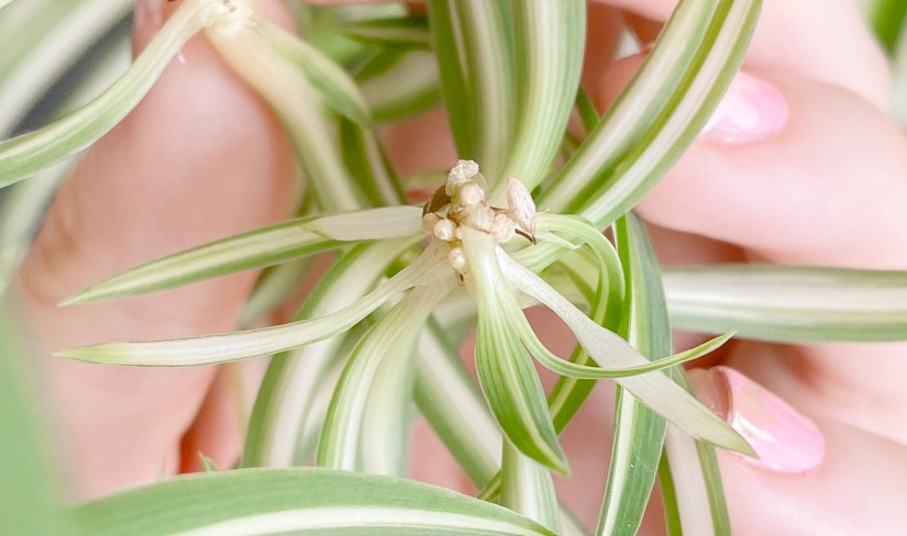 This plant was ready to be cut, which I could tell from its fully grown spider pup plantlets. When my spider plants first started flowering (yes, flowering?!) and making offshoots, I was so tempted to cut them early because I was impatient. Having done it the right way now, I’m really glad I waited!