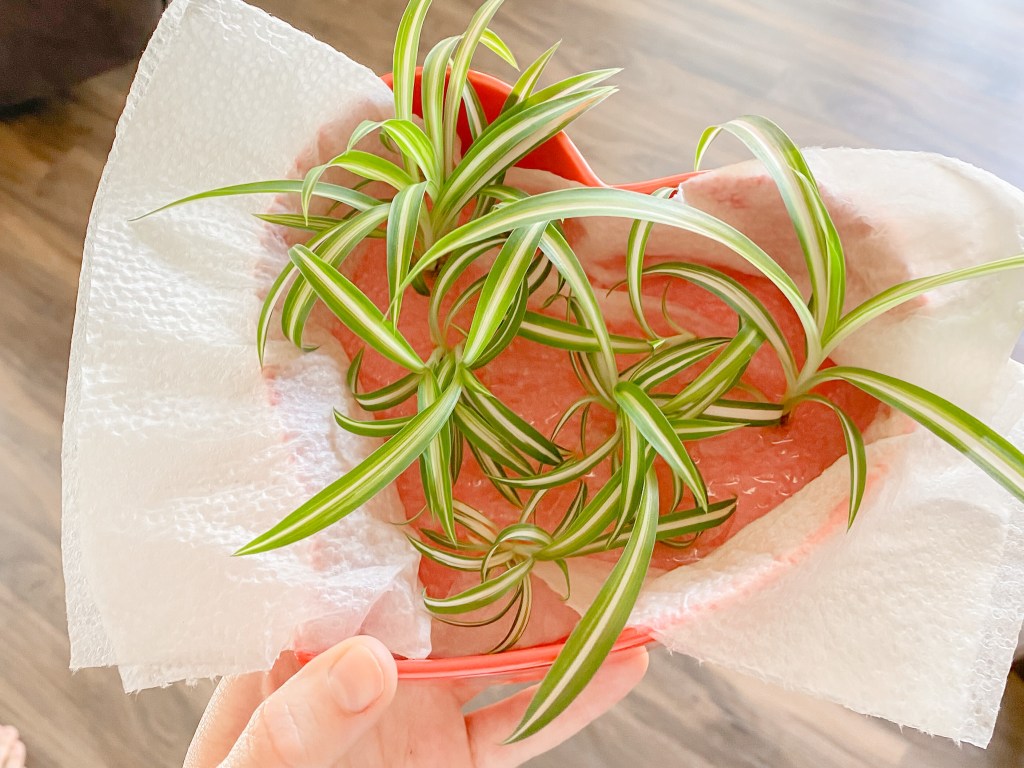 Step 3: Place spider plant babies into a bowl with a damp paper towel, and leave for a few days